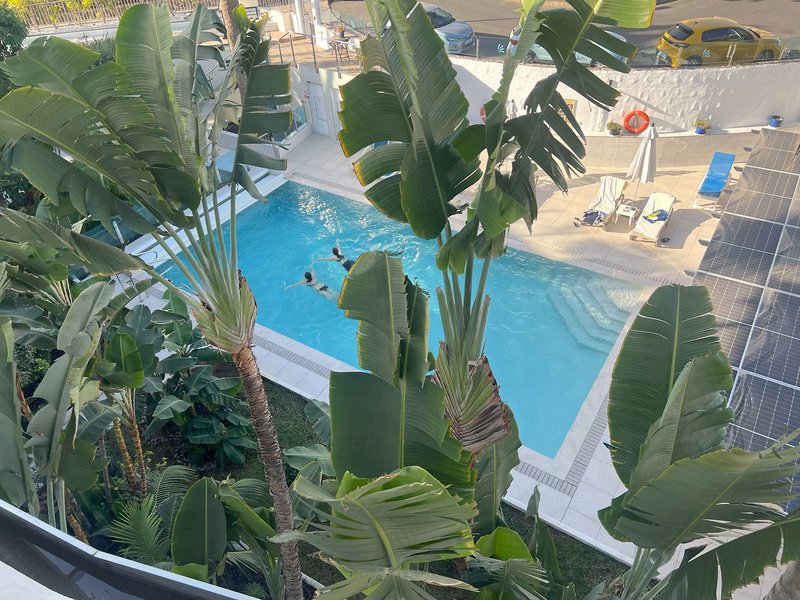 Der Außenbereich besteht aus einem kleinen tropischen Garten mit Salzwasser-Swimmingpool (im Winter beheizbar) und einer Sonnenterrasse mit Liegestühlen und Sonnenschirmen/Schattenplätzen.