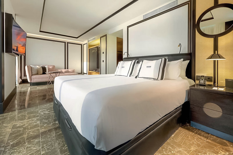 - 46-50 qm, Suite, kombinierter Wohn-/Schlafraum, Schreibtisch, 1 Doppelbett (Kingsize), 1 Sofabett, 1 Bad, Dusche, Badewanne, Whirlwanne, Bademantel, Badeslipper, Haartrockner, Kosmetikspiegel, Klimaanlage, Ventilator, Minibar kostenpflichtig, Safe, 1 TV (Sat-TV, Flachbildschirm), Musikanlage, iPod-Dockingstation, WLAN, Wasserkocher, Espressomaschine, Kaffee/Tee, Balkon oder Terrasse, Kopfkissen-Menü, Concierge-Service