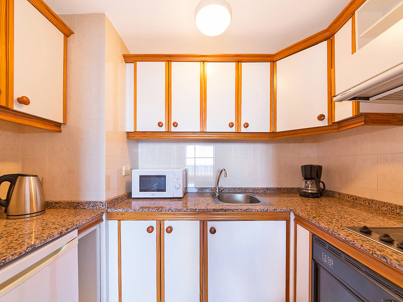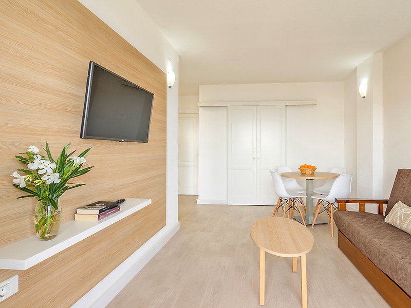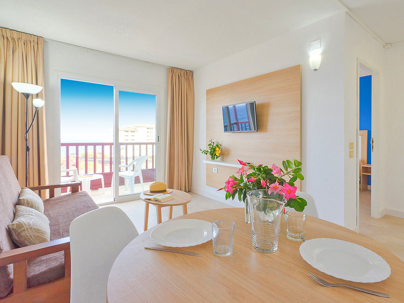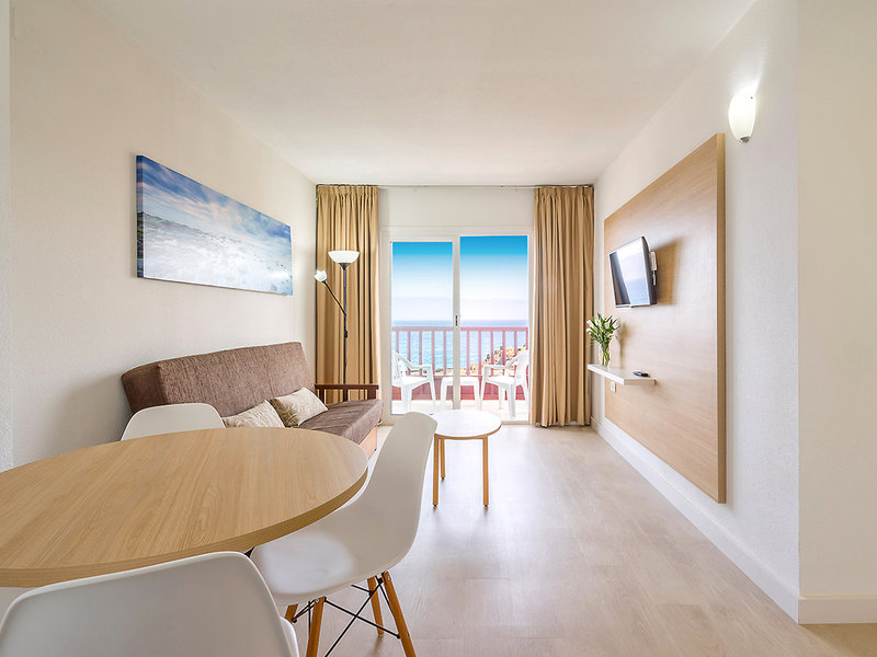 Wohnen: Appartement Typ B (APB, ca. 45 qm, renoviert), Wohn-/Schlafraum, sep. Schlafzimmer, Kitchenette mit Mikrowelle, Kaffeemaschine, Kühlschrank, Wasserkocher, Essecke, TV, WLAN, Mietsafe. Bad mit Dusche, WC, Föhn. Balkon, wahlweise Meerblick (APM). Max. 3E/2E+2K
