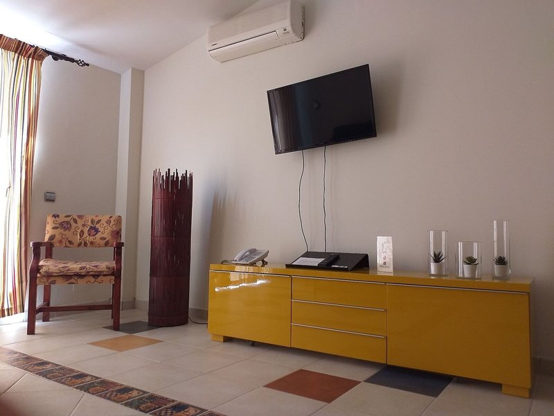So wohnen Sie: Für angenehmes Raumklima in den Zimmern sorgen eine Klimaanlage und ein Ventilator. Auf dem Balkon oder der privaten Terrasse der meisten Zimmer können die Gäste entspannen und den Blick auf das Meer genießen. Die Zimmer verfügen über ein Doppelbett oder ein Sofabett. Es gibt separate Schlafzimmer. Auch Baby- und Zustellbetten können zur Verfügung gestellt werden. Außerdem sind ein Safe, eine Minibar und ein Schreibtisch verfügbar. Die Kochnische ist mit einem Kühlschrank, einem Herd, einer Mikrowelle, einer Tee-/Kaffeemaschine und einem Backofen gut für Selbstversorger ausgestattet. Ein Bügelset ist für den zusätzlichen Komfort der Gäste verfügbar. Darüber hinaus sind ein Telefon mit Direktwahl, ein TV-Gerät mit Satelliten-/Kabelempfang und WiFi (ohne Gebühr) vorhanden. Im Badezimmer, ausgestattet mit einer Dusche und einer Badewanne, gibt es einen Haartrockner. Für besonderen Komfort in den Badezimmern sorgen Kosmetikartikel und eine Auswahl an Handtüchern. Außerdem sind rollstuhlgerechte Zimmer mit barrierefreiem Badezimmer buchbar. Die Apartmentanlage bietet Familien- und 38 Nichtraucherzimmer.
