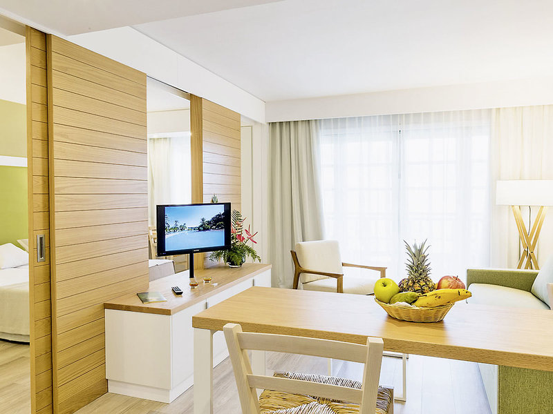 Premium-Appartement Typ B (ASP, ca. 48 qm), Wohnraum (Schlafsofa), separates Schlafzimmer, Kitchenette, TV, WLAN, Telefon, Safe. Dusche, WC, Bademäntel, Föhn. Balkon/Terrasse, inklusive Mietwagen Max. 3E/2E+2K, zur Alleinnutzung buchbar (ASS, ab 01.11.25)