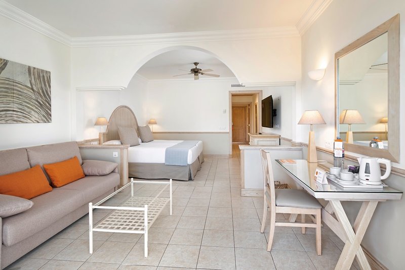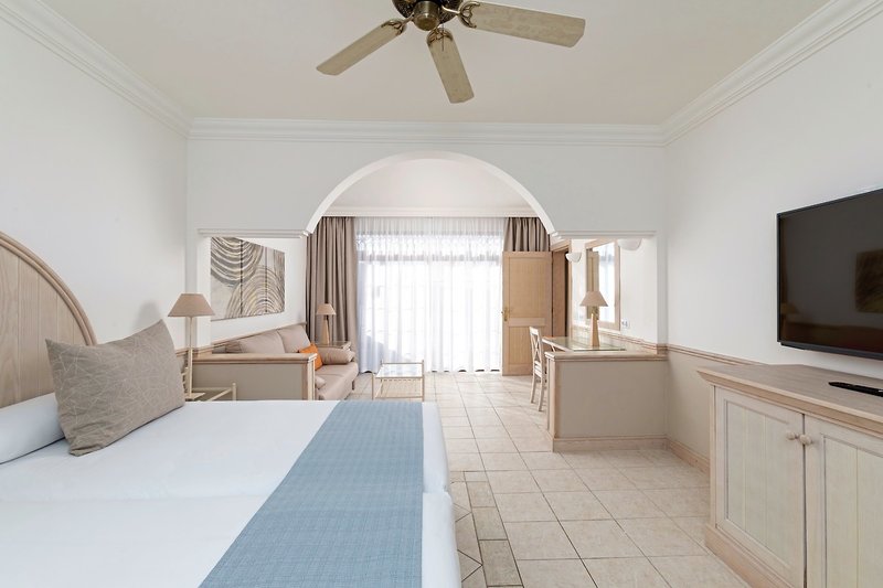 - 61-70 qm, Juniorsuite, renoviert (2025), optisch getrennter Wohn-/Schlafraum, Doppelbett (Kingsize), Sofabett, Dusche, Badewanne, Bademantel, Badeslipper, Haartrockner, Klimaanlage, Minibar kostenpflichtig, Safe, 2 TVs (Sat-TV), WLAN, Wasserkocher, Balkon oder Terrasse (möbliert), bei Ankunft im Zimmer Wasser