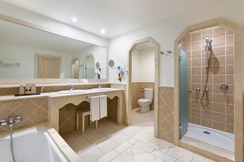 - 61-70 qm, Juniorsuite, renoviert (2025), optisch getrennter Wohn-/Schlafraum (mit Schiebetür), Einzelbett, Doppelbett (Kingsize), Dusche, Badewanne, Bademantel, Badeslipper, Haartrockner, Klimaanlage, Minibar kostenpflichtig, Safe, 2 TVs (Sat-TV), WLAN, Wasserkocher, Balkon oder Terrasse (möbliert), bei Ankunft im Zimmer Wasser