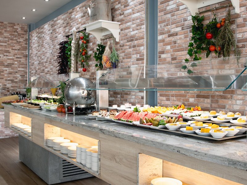 Essen & Trinken: Der gastronomische Bereich wartet mit einem Restaurant und einer Bar auf. Die Unterbringung bietet als buchbare Verpflegungsleistungen Halbpension und All-Inclusive. Ein reichhaltiges Frühstücksbuffet, Mittagessen und Abendessen sind lecker und abwechslungsreich gestaltet. Diätgerichte und Kindermenüs werden auf Wunsch zubereitet. Zusätzlich sind spezielle Verpflegungsangebote und Snacks erhältlich. Eine besondere Attraktion ist das Showcooking. Das Haus führt ein Sortiment alkoholischer und alkoholfreier Getränke.