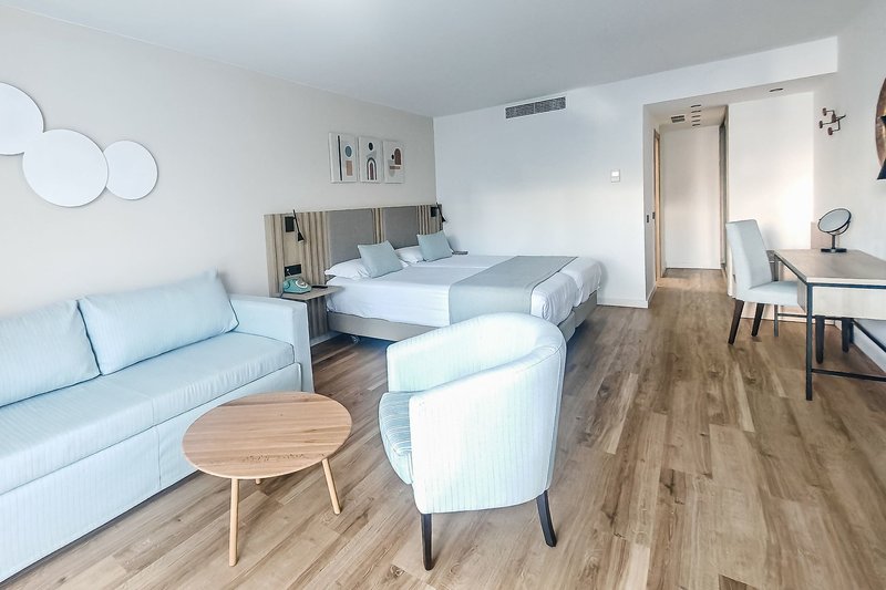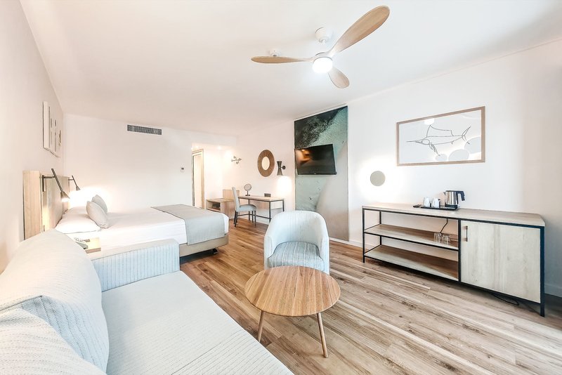 Juniorsuite: Wie die Doppelzimmer, jedoch größer ohne räumliche Abtrennung mit Sitzgelegenheit, mit seitlichem Meerblick, Terrasse mit Liegen, Kaffee-Kapsel-Maschine mit 4 gratis Caps (Auffüllung gegen Gebühr), TV-Flat-Screen sowohl im Schlaf- als auch im Wohnbereich, Telefon, Klimaanlage und Heizung, Wi-Fi (inklusive) sowie Bademantel und Hausschuhe. (JS2) (Belegungen: Erwachsene bis max. 2+Kinder bis max. 2 oder Erwachsene bis max. 3)