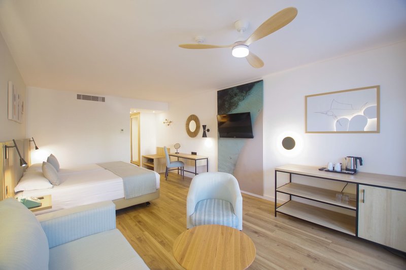 Junior Suite: Ako dvojlôžkové izby, ale väčšie, bez samostatného sedenia, s bočným výhľadom na more, terasou s ležadlami, kávovarom na kapsuly so 4 bezplatnými kapsulami (dopĺňanie za poplatok), TV s plochou obrazovkou v spálni aj obývacej izbe, telefónom, klimatizáciou a kúrením, Wi-Fi (v cene) a županom a papučami. (JS2) (Obsadenosť: Dospelí do 2 rokov + deti do 2 rokov alebo dospelí do 3 rokov)