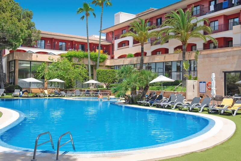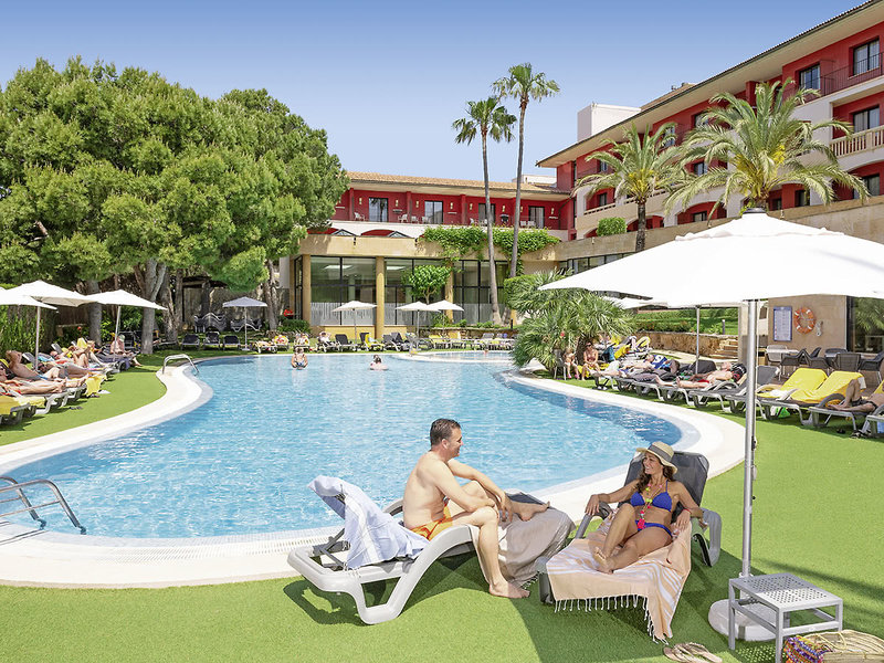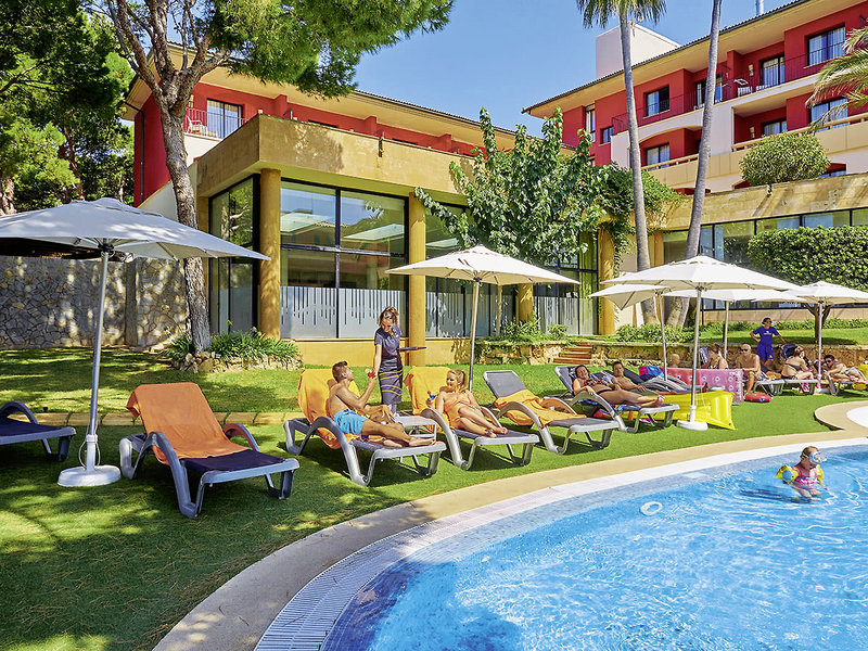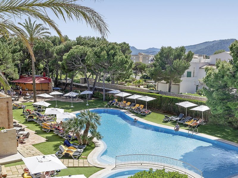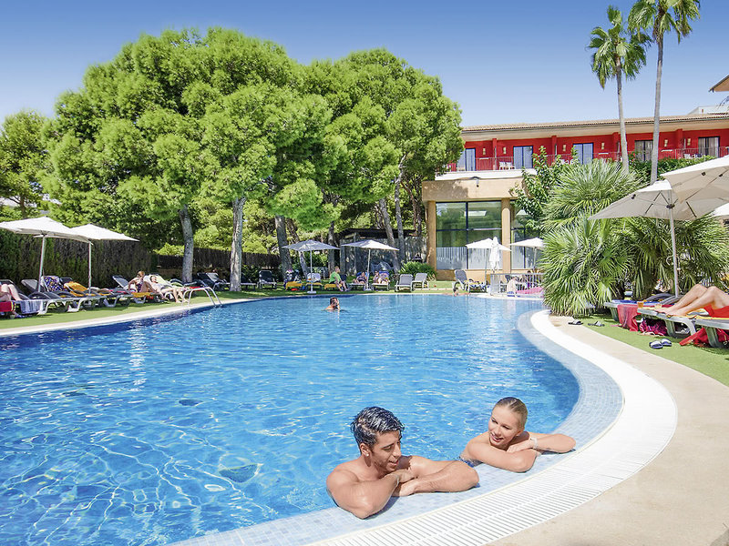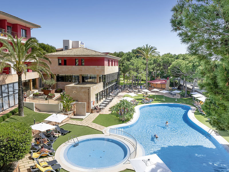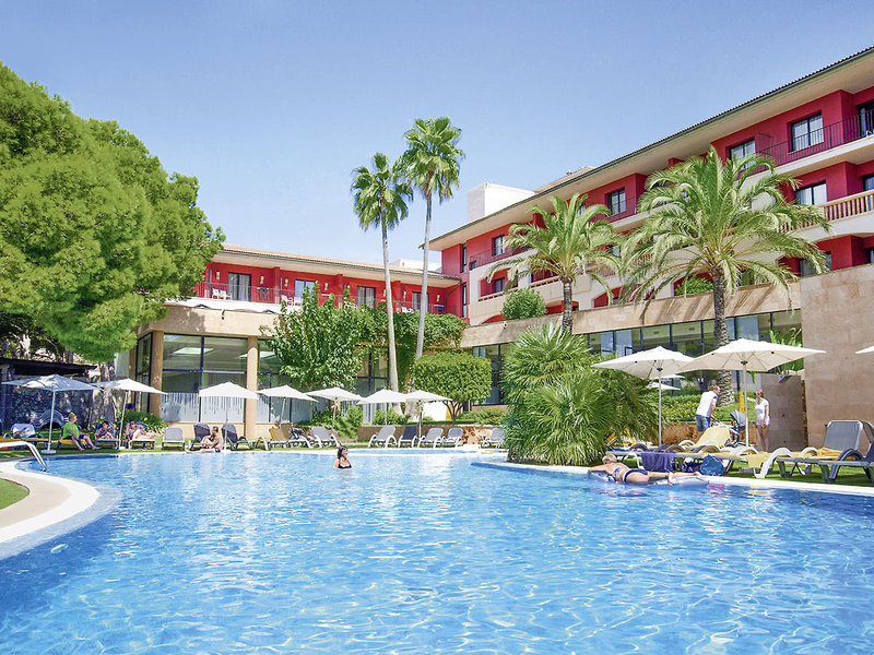Ausstattung: Geschmackvolle Ferienanlage im mallorquinischen Villenstil mit gepflegtem Garten, Schatten spendenden Pinien und Palmen, 2 Pools (1 Aktivpool und 1 Ruhepool), Sonnenterrassen, Liegen und Schirme inklusive (Badetücher geg. Kaution, Wechsel geg. Gebühr), Pool-/Snackbar, teilweise überdachte Sitzterrasse. Großzügige, lichtdurchflutete Empfangshalle, Sitzgruppen, Rezeption, WLAN inklusive, Aufenthaltsräume, Bar mit Gartenterrasse und Restaurant mit Außenterrasse. Landeskategorie: 4 Sterne, 178 Einheiten, 3 Etagen, 5 Lifte.