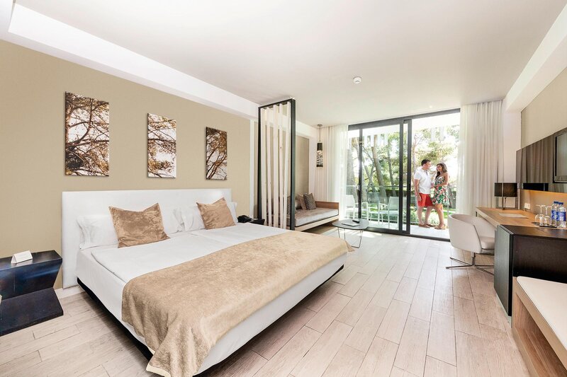 Špeciálny luxus pre vašu dovolenku: junior suity (JS, cca 32 m2), priestranné a moderne zariadené, integrovaný obývací priestor s rozkladacou pohovkou, klimatizácia (teplá/studená), mini chladnička, TV, telefón, trezor na prenájom. Luxusná kúpeľňa, sprchovací kút na úrovni podlahy, samostatné WC, sušič vlasov. Balkón/terasa. Maximálne 3E