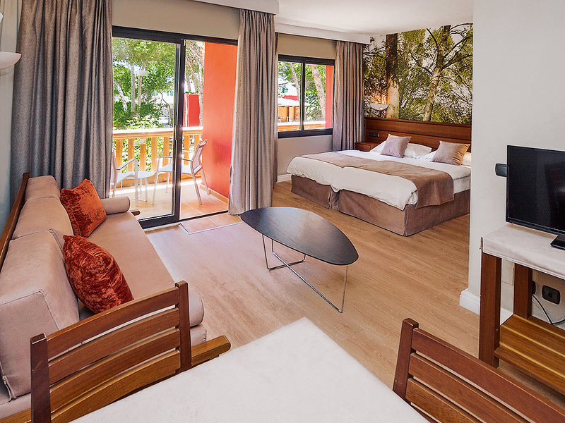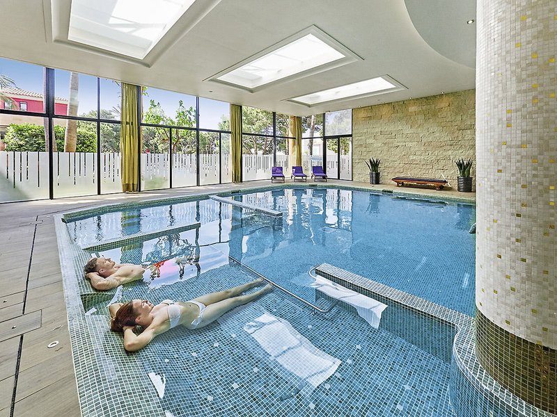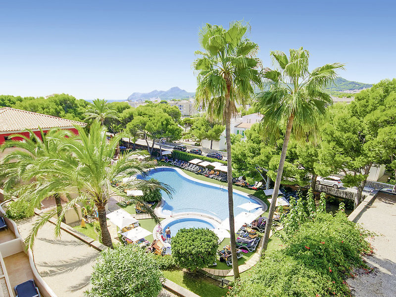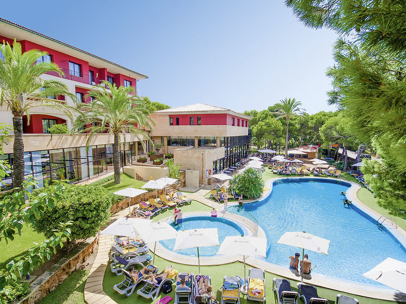 Ausstattung: Geschmackvolle Ferienanlage im mallorquinischen Villenstil mit gepflegtem Garten, Schatten spendenden Pinien und Palmen, 2 Pools (1 Aktivpool und 1 Ruhepool), Sonnenterrassen, Liegen und Schirme inklusive (Badetücher geg. Kaution, Wechsel geg. Gebühr), Pool-/Snackbar, teilweise überdachte Sitzterrasse. Großzügige, lichtdurchflutete Empfangshalle, Sitzgruppen, Rezeption, WLAN inklusive, Aufenthaltsräume, Bar mit Gartenterrasse und Restaurant mit Außenterrasse. Landeskategorie: 4 Sterne, 178 Einheiten, 3 Etagen, 5 Lifte.