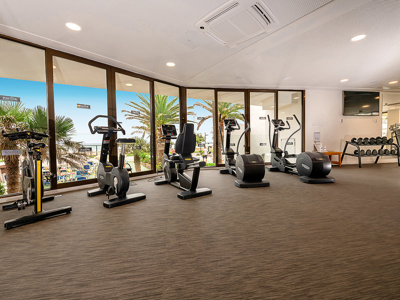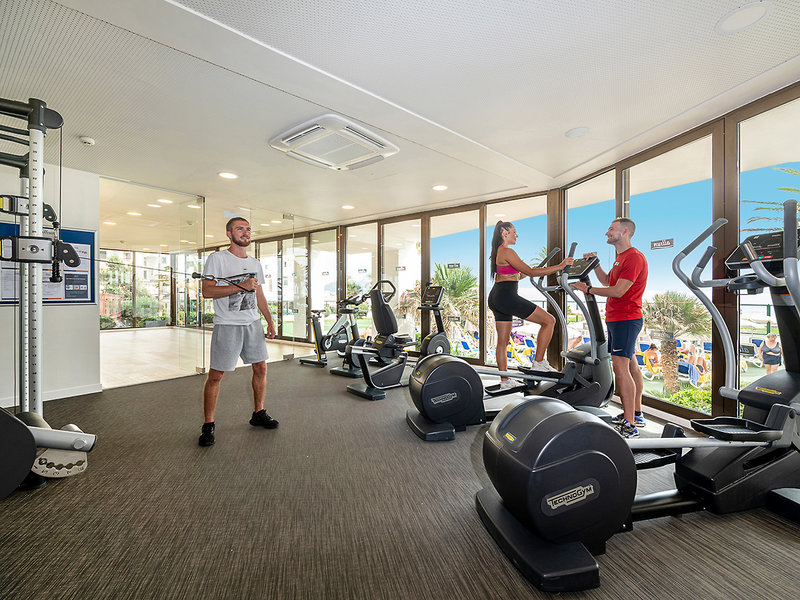 Wellness a fitness: Priestranné fitness centrum s výhľadom na more (cca 90 m², od 16 rokov) s kardio vybavením, miestnosť na skupinové cvičenie (cca 70 m²), posilňovanie fascií, body fit