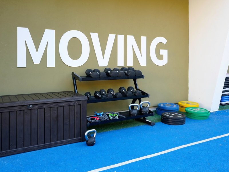 - Fitnessraum: es existiert kein Fitnessraum im eigentlichen Sinne sondern ein Multifunktionssportplatz mit Outdoorfitnessbereich