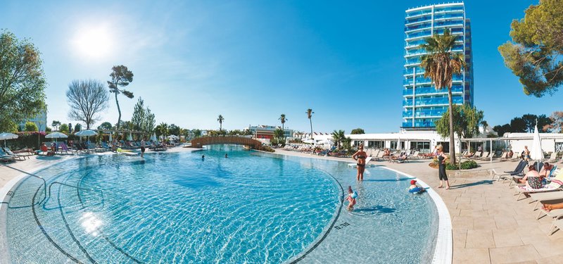 Ausstattung: Garten, 3 Pools, Kinderpool. Liegen, Schirme am Pool und am Strand (geg. Geb.), Auflagen, Handtücher am Pool (geg. Geb.), Pool-/Snackbar, Sonnen-, Dachterrasse. Empfangshalle, Rezeption, Lobby-Bar, Safe (geg. Geb.), TV-Lounge. 3 Restaurants (Buffet) mit Terrasse, 3 Bars, Shop, Parkplatz (geg. Geb.). 370 Zimmer, 14 Etagen, 5 Lifte.
