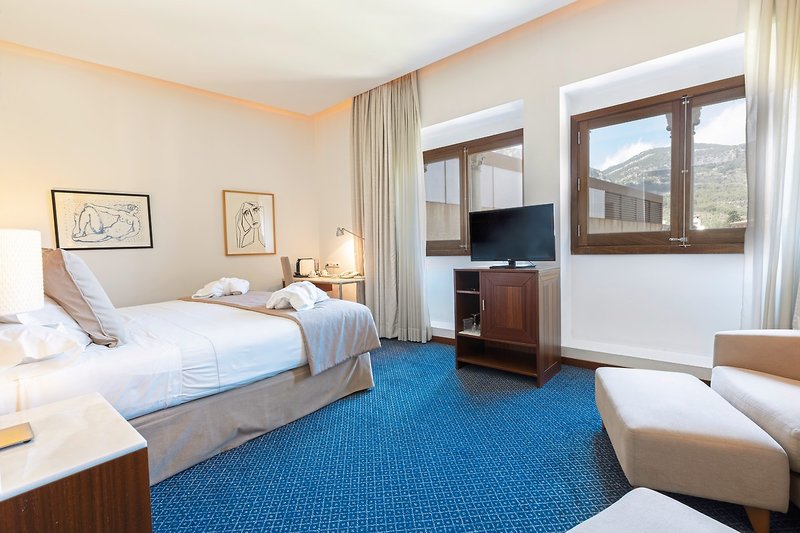 - 26-30 qm, Doppel, Superior, 1 Bad, Dusche oder Badewanne, Bademantel, Haartrockner, Klimaanlage, Heizung, Minibar kostenpflichtig, Safe, TV, WLAN, Wasserkocher, Balkon (möbliert)