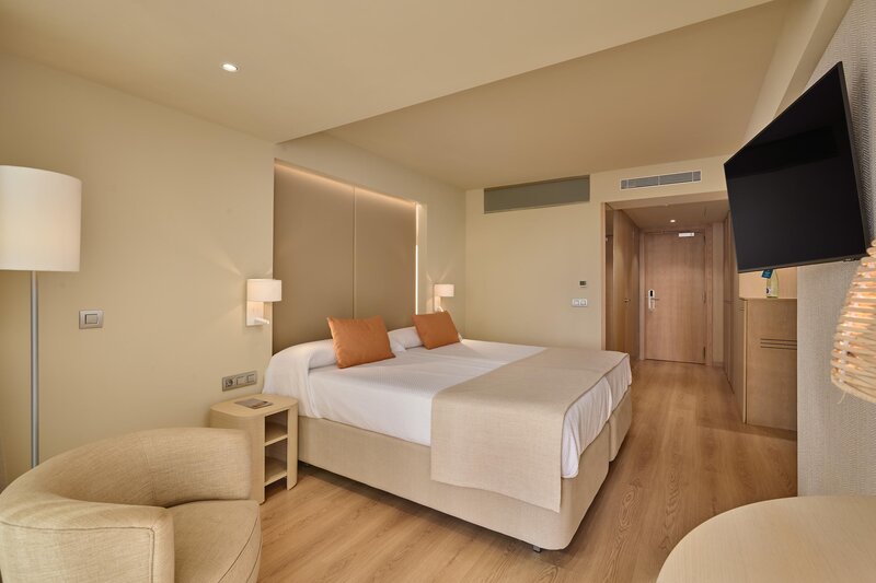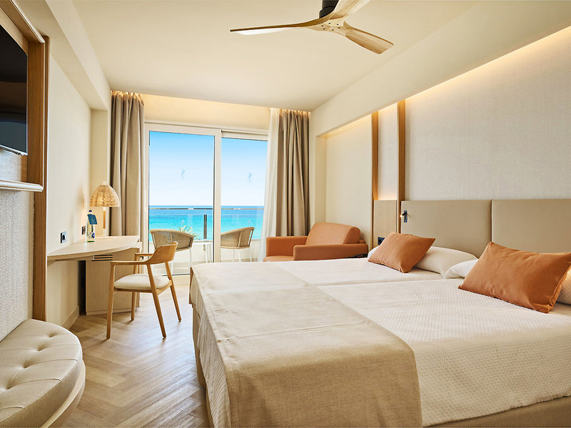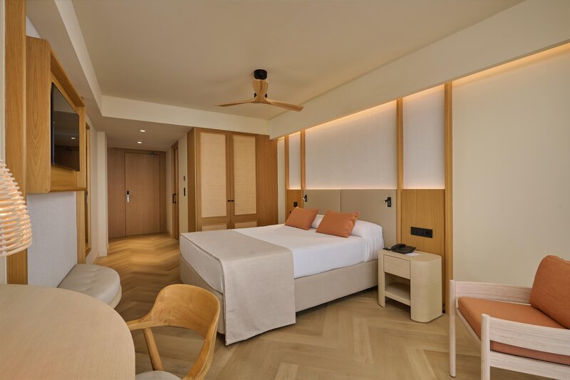 Wohnen: Doppelzimmer (DZP, ca. 22 qm), renoviert, Klimaanlage (warm/kalt), TV, Telefon, WLAN (inkl.), Safe. Bad, WC, Föhn. Balkon. Poolblick. Wahlweise Meerblick (DZM). Max. 3E