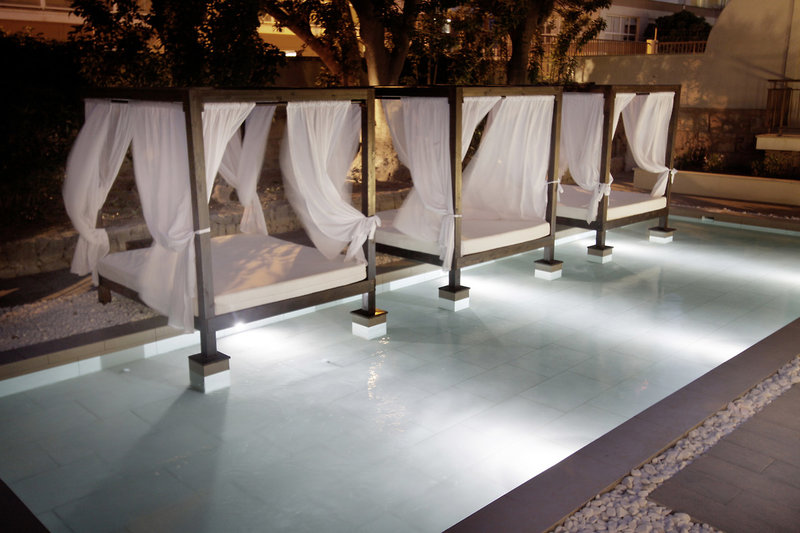 - Piesočnatá pláž: mierne sa zvažujúca, oddelená od komplexu promenádou, slnečníky (za poplatok), ležadlá (za poplatok)