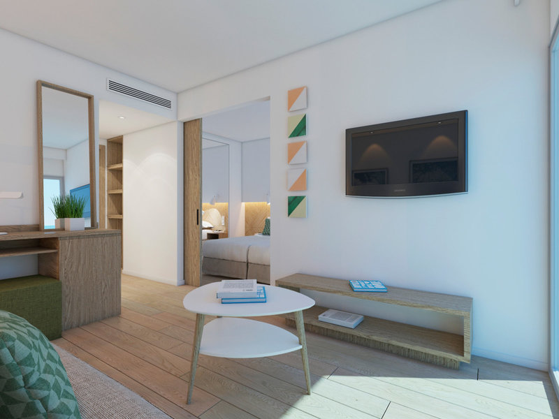 - Promotion Suite (SUZ1), Suite, Nichtraucherzimmer, im Hauptgebäude, Innenhofblick, ca. 25 - 30 m², letzte Komplettrenovierung 2020, Gesamtanzahl der Räume in diesem Zimmertyp: 1, Aufteilung wie folgt: kombiniertes Wohn-/Schlafzimmer, 1 Schlafzimmer, 2 Einzelbetten (90x190cm), 1 Schlafsofa (80x180cm), Klimaanlage: ohne Gebühr, individuell regelbar, Heizung: individuell regelbar, Fußboden: PVC, Safe: gegen Gebühr, Schreibtisch, Kühlschrank: ohne Gebühr, Telefon, Internet: WLAN/WiFi: ohne Gebühr, Fernseher: Flatscreen, im Wohnbereich, deutsches Programm, Radio, Reinigungsservice: täglich, Dusche, WC, Föhn, Kosmetikspiegel, Balkon: mit Sitzgelegenheit