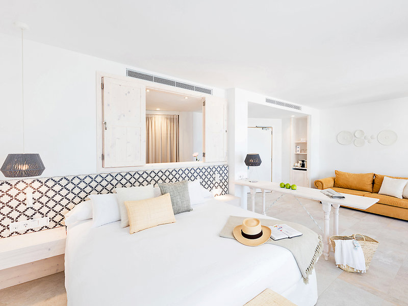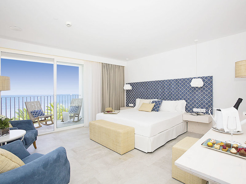 Juniorsuite (JS, ca. 35 qm), Klimaanlage (warm/kalt), Minibar (gegen Gebühr), Kaffee-/Teezubereiter, Kapselkaffeemaschine (Kapseln inkl.), Kopfkissenmenü, Smart-TV (40 Zoll), Telefon, WLAN (inkl.), Safe, Bluetooth-Lautsprecher. Badezimmer mit Dusche, WC, Föhn, Bademantel und Slipper. Balkon mit Liegen, direkter Meerblick. Max. 2E