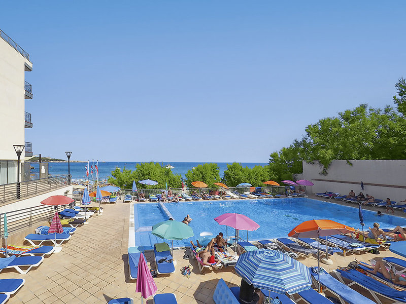 Ausstattung: Voll klimatisiertes, aus 2 Gebäuden bestehendes Hotel. Direkt zur Meerseite oberhalb des Strandes gelegener Pool mit großer Sonnenterrasse, Liegen und Schirmen (Badetücher inklusive), Pool-/Snackbar mit Sitzterrasse. Großzügige Empfangshalle, Rezeption, WLAN (inklusive), Aufenthaltsräume, Fernsehecke, Bar, kleines Tapasrestaurant (Reservierung erforderlich), Hauptrestaurant mit Meerblick. Landeskategorie: 4 Sterne, 210 Zimmer, 4 Etagen, 4 Lifte.