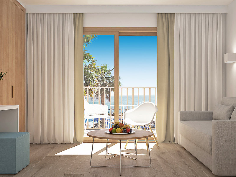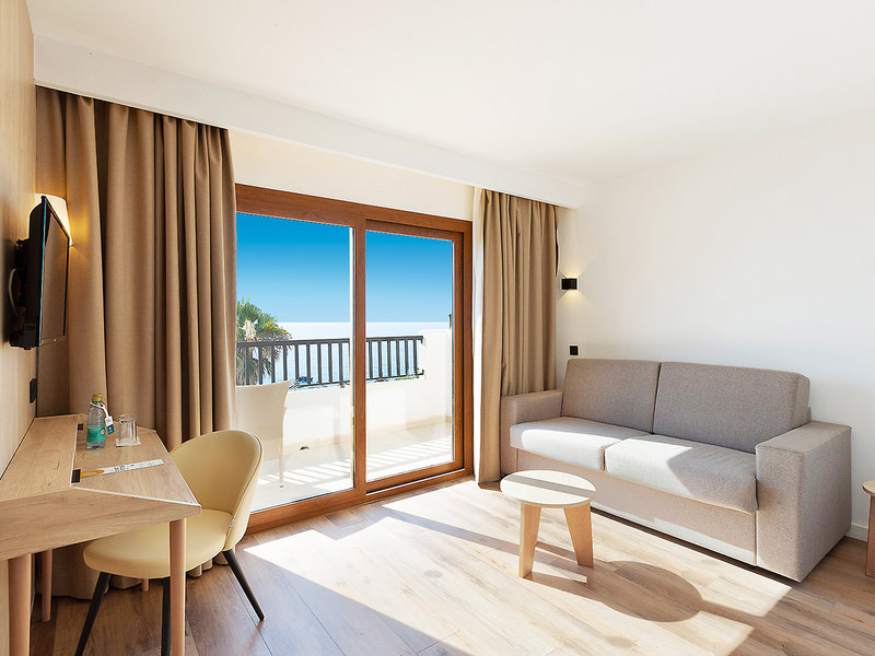 Suiten mit Meerblick (SUM, ca. 45 qm), komplett renoviert in W19/20, modern und hell gestaltet, Wohnraum mit Schlafsofa, separates Schlafzimmer, Klimaanlage (warm/kalt), Kitchenette, Willkommens-Minibar, Kapselkaffeemaschine, TV (32 Zoll), Telefon, WLAN (inkl.), Safe. Badezimmer mit Dusche, WC, Föhn. Bademantel und Hausschuhe. Balkon/Terrasse. Max. 3E/3E+1K