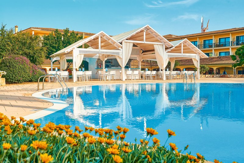 Außen befinden sich eine gepflegte Gartenanlage mit großem, lagunenartigen Pool, eine Poolbar sowie Liegen und Sonnenschirmen.