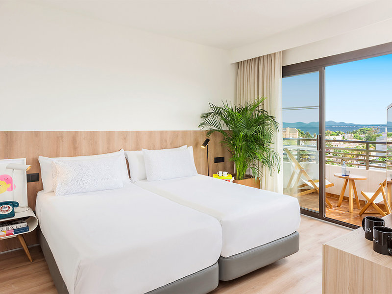 Ubytovanie: Junior Suite (JSL, cca 45 m², od 01.04.2026), svetlý a moderne zariadený, obývacia izba, rozkladacia pohovka, klimatizácia, TV, telefón, Wi-Fi (v cene), trezor. Sprcha, WC, fén. Balkón, voliteľne s výhľadom na bazén (JLP, od 01.04.2026). Max. 2 dospelí + 2 deti