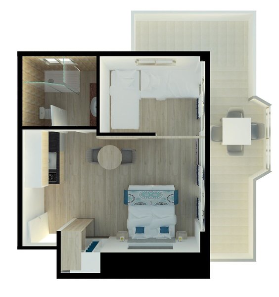 - 1 Bedroom apartment Superior (APX3), Appartement, Nichtraucherzimmer, ca. 36 m², Gesamtanzahl der Räume in diesem Zimmertyp: 2, Aufteilung wie folgt: kombiniertes Wohn-/Schlafzimmer, 1 Schlafzimmer, 2 Einzelbetten, 1 Schlafsofa, Klimaanlage: individuell regelbar, kalt, warm, Safe: ohne Gebühr, Kochnische, Kühlschrank, Mikrowelle, Kaffeemaschine, Toaster, Telefon, Internet: WLAN/WiFi: ohne Gebühr, Fernseher, Reinigungsservice: mehrmals pro Woche, ohne Gebühr, Dusche, WC, Föhn, Balkon: mit Sitzgelegenheit