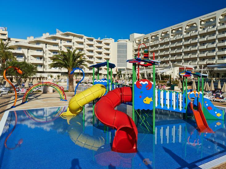 Ausstattung: Garten, 2 Pools, Kinderpool, Wasserrutsche. Liegen, Schirme am Pool und am Strand (geg. Geb.), Handtücher am Pool (geg. Geb.), Pool-/Snackbar, Sonnenterrasse. Empfangshalle, Rezeption, Lobby-Bar. Restaurant mit Terrasse, 2 Bars. 210 Zimmer, 7 Etagen, 1 Nebengebäude, 5 Lifte.