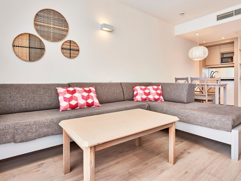 - Apartments Area D (APX4), Appartement, im Nebengebäude, ca. 40 m², letzte Komplettrenovierung 2021, Gesamtanzahl der Räume in diesem Zimmertyp: 2, Aufteilung wie folgt: kombiniertes Wohn-/Schlafzimmer, 1 Schlafzimmer, 2 Einzelbetten, 2 Schlafsofas, Klimaanlage: individuell regelbar, kalt, warm, Fußboden: Laminat, Safe: gegen Gebühr, Kühlschrank, Mikrowelle, Telefon, Internet: WLAN/WiFi: ohne Gebühr, Fernseher: Flatscreen, im Wohnbereich, im Schlafzimmer, deutsches Programm, Sat-TV, Reinigungsservice: täglich, ohne Gebühr, Dusche, Föhn, Balkon: mit Sitzgelegenheit