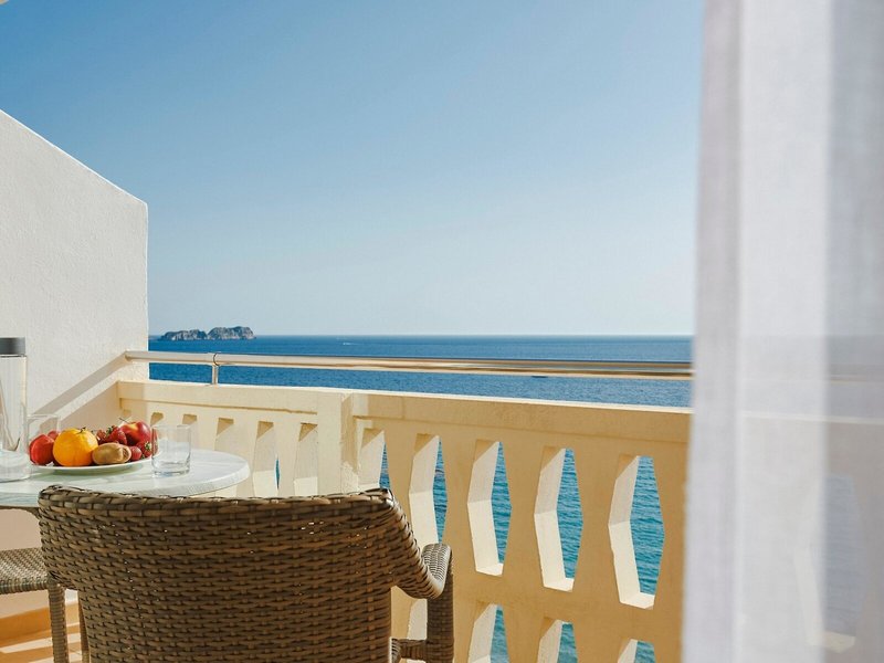 - Double room superior frontal seaview (DZM1), Doppelzimmer, Nichtraucherzimmer, im Hauptgebäude, Meerblick, ca. 25 m², letzte Teilrenovierung 2022, Gesamtanzahl der Räume in diesem Zimmertyp: 1, Aufteilung wie folgt: kombiniertes Wohn-/Schlafzimmer, 2 Einzelbetten, Babybett: ohne Gebühr, Anfrage nicht notwendig, Reservierung notwendig, Klimaanlage: ohne Gebühr, individuell regelbar, zentral gesteuert, Heizung: zentral gesteuert, Fußboden: Fliesenboden, Safe: ohne Gebühr, Sofa, Schreibtisch, Kühlschrank: ohne Gebühr, Nespressomaschine, Minibar: Wasser: ohne Gebühr, Telefon, Internet: WLAN/WiFi: ohne Gebühr, Fernseher: Flatscreen, deutsches Programm, Dusche, WC, Föhn, Kosmetikspiegel, Balkon oder Terrasse: mit Sitzgelegenheit