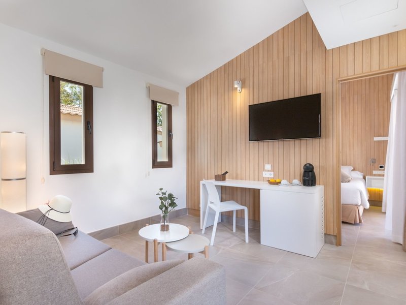 - Bungalow Superiror with Jacuzzi (BUX4), Bungalow, Nichtraucherzimmer, im Nebengebäude, Gartenseite, ca. 27 m², letzte Komplettrenovierung 2019, Gesamtanzahl der Räume in diesem Zimmertyp: 2, Aufteilung wie folgt: kombiniertes Wohn-/Schlafzimmer, 1 Schlafzimmer, 2 Einzelbetten, 1 Schlafsofa, Babybett: ohne Gebühr, Anfrage & Reservierung notwendig, Klimaanlage: ohne Gebühr, individuell regelbar, Fußboden: Laminat, Safe: gegen Gebühr, Deckenventilator, Schreibtisch, Kühlschrank: ohne Gebühr, Kaffee-/Teezubereiter, Telefon, Internet: WLAN/WiFi: ohne Gebühr, Fernseher: deutsches Programm, Reinigungsservice: täglich, ohne Gebühr, Dusche, WC, Föhn, Balkon oder Terrasse: mit Whirlpool, Terrasse: mit Liegestühlen