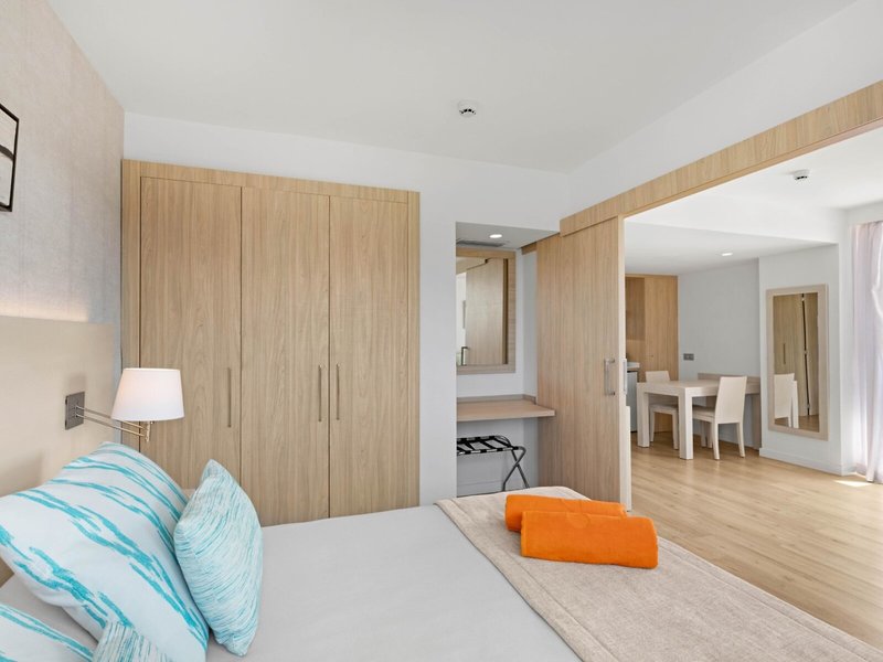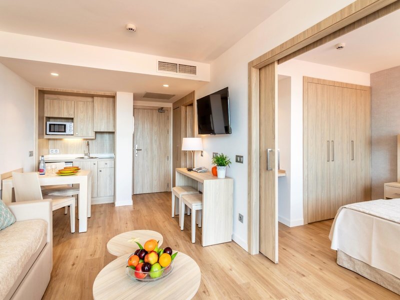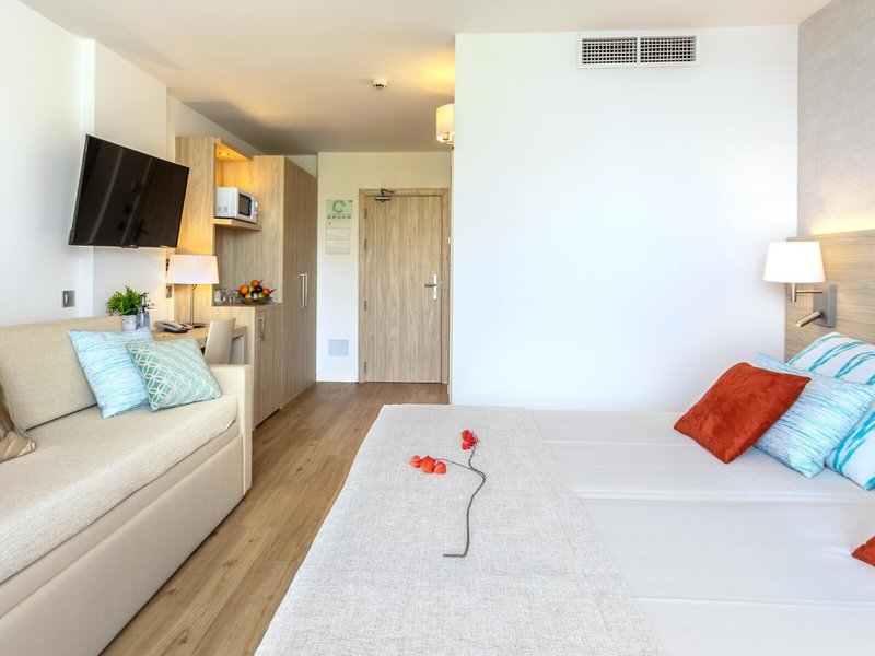 - Apartment pool view (APX3), Appartement, im Hauptgebäude, Poolblick, ca. 38 m², letzte Komplettrenovierung 2022, Gesamtanzahl der Räume in diesem Zimmertyp: 2, Aufteilung wie folgt: kombiniertes Wohn-/Schlafzimmer, 1 Schlafzimmer, 1 Doppelbett, 1 Schlafsofa, Babybett: ohne Gebühr, Anfrage notwendig, Klimaanlage: ohne Gebühr, saisonabhängig; wetterabhängig, zentral gesteuert, Heizung: saisonabhängig; wetterabhängig, zentral gesteuert, Fußboden: Laminat, Safe: ohne Gebühr, Kochnische, Kühlschrank: ohne Gebühr, Kochplatte, Mikrowelle, Kaffeemaschine, Wasserkocher, Toaster, Esstisch, Telefon, Internet: WLAN/WiFi: ohne Gebühr, Fernseher: Flatscreen, im Wohnbereich, im Schlafzimmer, deutsches Programm, Sat-TV, Reinigungsservice: mehrmals pro Woche, ohne Gebühr, Dusche, WC, Föhn, Kosmetikspiegel, Balkon: mit Sitzgelegenheit