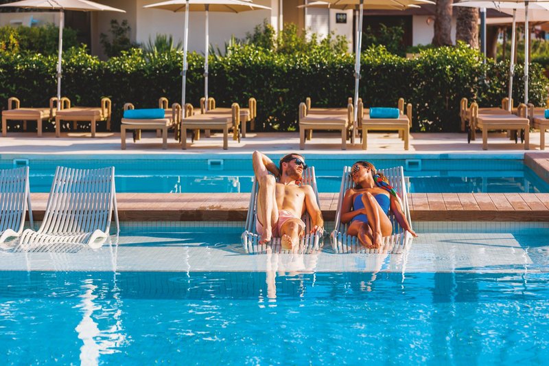 Ausstattung: Das traumhaft gelegene Adults-Only Hotel bietet 117 Zimmer auf 4 Etagen, eine Lobby mit Rezeption, 3 Lifte, ein Restaurant und eine Bar. Die Strandbar hat einen fantastischen Blick auf das Meer (nur in den Sommermonaten geöffnet, gegen Gebühr). Alle Gesellschaftsräume sind klimatisiert. In der großen Gartenanlage befindet sich eine Poollandschaft mit Liegen, Sonnenschirmen (kostenlos) und Balibetten (gegen Gebühr). Außerdem steht in den Sommermonaten das Abendessen auch im À-la-carte-Restaurant mit neuen Chill-out Bereich mit Meerblick (gegen Gebühr) zur Verfügung.