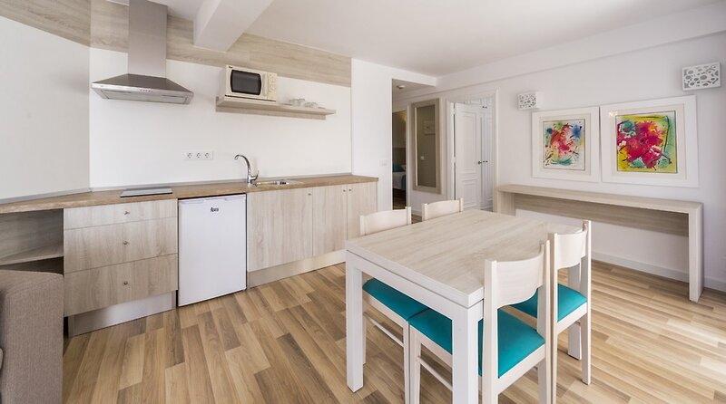 Nadštandardný apartmán s moderným vybavením: 1 spálňa s 2 samostatnými lôžkami, obývacia/spacia časť s rozkladacou pohovkou, kuchynský kút (s mikrovlnnou rúrou), kúpeľňa so sprchovacím kútom/WC, sušič vlasov, TV, telefón, Wi-Fi, trezor (za poplatok), klimatizácia, zariadený balkón s výhľadom na bazén a čiastočne zatieneným výhľadom na záliv Cala Galdana.