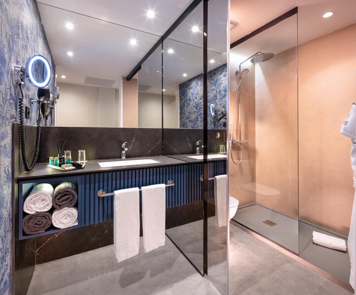 Suite (Doppel): Minibar (geg. Geb.). Wasserkocher, Handtücher. TV, Telefon, Internet (geg. Geb.), Safe (geg. Geb.). Bad/Dusche, WC, Jacuzzi, Föhn, Bademantel. Balk./Terr. Max. 2E.