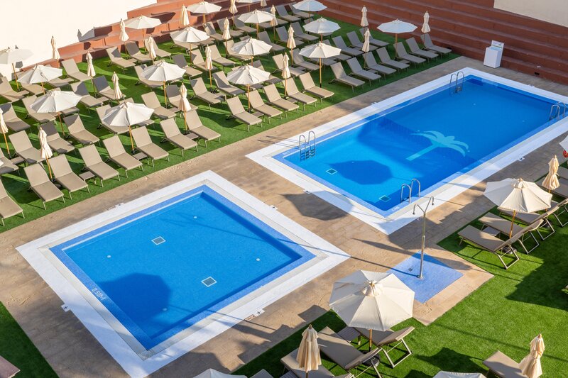 Ausstattung: 5 Pools, separater Kinderpool. Liegen, Schirme, Auflagen am Pool (inkl.). Empfangshalle, Rezeption, WLAN, Safe (geg. Geb.), Lounge. Kiosk, Friseur, Parkplatz. 413 Zimmer, 6 Lifte.