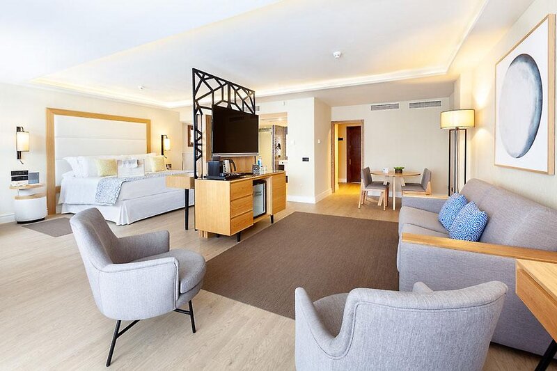 Suiten (SU, ca. 80 qm), offener Wohn-/ Schlafraum, Klimaanlage, TV (49 Zoll), Telefon, WLAN, Safe, Minibar (geg. Geb.), Nespresso®-Kaffeemaschine. Offenes Badezimmer, Dusche, WC, Föhn. Balkon/Terrasse, wahlweise mit Balkon und seitlichem Meerblick (SUM). Max. 2E+2K/3E