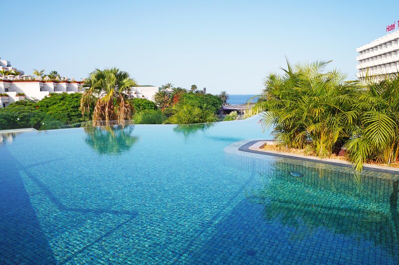 Ausstattung: 3 Pools, Kinderpool. Liegen, Schirme am Pool und am Strand (geg. Geb.), Handtücher am Pool (geg. Geb.), Pool-/Snackbar. Empfangshalle, Rezeption, Lobby-Bar, TV-Lounge. 2 Restaurants mit internationalen Speisen, 2 Bars, Shop, Friseur, Parkplatz (geg. Geb.). 354 Zimmer, 8 Etagen, 5 Lifte.