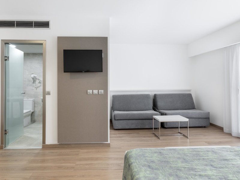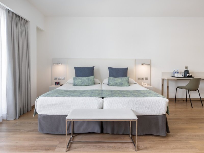- Promotion Standard Room (DZZ1), Doppelzimmer, Nichtraucherzimmer, im Hauptgebäude, Poolblick, Innenhofblick, Blick auf Vistas al Parking o a la Piscina, ca. 23 - 23 m², letzte Komplettrenovierung 2019, letzte Teilrenovierung 2019, Gesamtanzahl der Räume in diesem Zimmertyp: 1, Aufteilung wie folgt: 1 Schlafzimmer, 2 Einzelbetten (100x200cm), 1 Schlafsofa, Babybett: ohne Gebühr, Anfrage & Reservierung notwendig, Klimaanlage: ohne Gebühr, zentral gesteuert, kalt, Fußboden: Laminat, Safe: pro Tag ab 2.50 EUR, bei All Inclusive inklusive, Schreibtisch, Kühlschrank: ohne Gebühr, Wasserkocher, Minibar: gegen Gebühr, Telefon, Internet: WLAN/WiFi: ohne Gebühr, Fernseher: Flatscreen, im Schlafzimmer, deutsches Programm, Sat-TV, Roomservice: täglich 07:30 Uhr - 10:30 Uhr, täglich 12:30 Uhr - 15:30 Uhr, täglich 18:30 Uhr - 21:45 Uhr, gegen Gebühr, Reinigungsservice: täglich 09:00 Uhr - 16:00 Uhr, ohne Gebühr, Dusche, WC, Föhn, Balkon oder Terrasse: mit Sitzgelegenheit