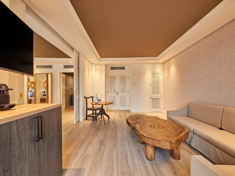 - JUNIOR SUITE INLAND VIEW (JSX1), Juniorsuite, Nichtraucherzimmer, ca. 42 m², letzte Komplettrenovierung 2017, Gesamtanzahl der Räume in diesem Zimmertyp: 1, Aufteilung wie folgt: kombiniertes Wohn-/Schlafzimmer, 2 Einzelbetten (100x200cm), 1 Zustellbett, Babybett: ohne Gebühr, Anfrage & Reservierung notwendig, Klimaanlage: ohne Gebühr, zentral gesteuert, kalt, Safe: ohne Gebühr, Minibar: gegen Gebühr, Softdrinks: gegen Gebühr, bei All Inclusive inklusive, Wasser: gegen Gebühr, bei All Inclusive inklusive, alkoholische Getränke: gegen Gebühr, Minibarauffüllung: täglich, Telefon, Internet: WLAN/WiFi: ohne Gebühr, Fernseher: Flatscreen, deutsches Programm, Sat-TV, Roomservice: täglich 07:00 Uhr - 23:00 Uhr, gegen Gebühr, Reinigungsservice: täglich, ohne Gebühr, Dusche, Regendusche, WC, Bademantel: ohne Gebühr, Slipper: ohne Gebühr, Föhn, Kosmetikspiegel, Balkon oder Terrasse: mit Sitzgelegenheit