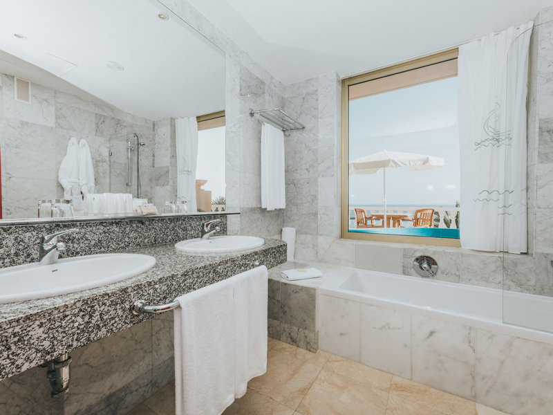 - Standard Twin Sea View (DZM1), Doppelzimmer, im Hauptgebäude, erste Strandreihe, Meerblick, Buchtblick, ca. 29 - 32 m², Gesamtanzahl der Räume in diesem Zimmertyp: 1, Aufteilung wie folgt: 1 Schlafzimmer, Klimaanlage: ohne Gebühr, individuell regelbar, Fußboden: Fliesenboden, Safe: ohne Gebühr, Schreibtisch, Kühlschrank, Minibar: gegen Gebühr, Telefon, Internet: WLAN/WiFi: ohne Gebühr, Fernseher: Flatscreen, im Schlafzimmer, deutsches Programm, Sat-TV, Roomservice: täglich, gegen Gebühr, Reinigungsservice, Badewanne, WC, Föhn, Kosmetikspiegel, Balkon oder Terrasse: mit Sitzgelegenheit