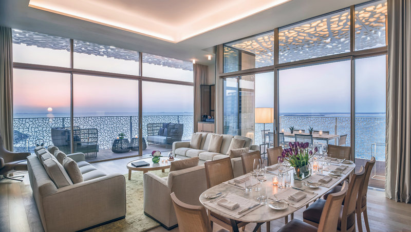 Die Zimmer: Die insgesamt 101 Zimmer und Suiten und 20 Villen des Hotels umringen den Yachthafen und bieten freien Blick auf das Meer und Dubais Skyline. Alle Zimmer und Suiten mit eigener Terrasse. Bad mit Badewanne und Dusche, Bademantel, Föhn, TV, WLAN, Minibar, Safe, Klimaanlage. Die Zimmer bieten Ausblicke auf das Meer, die Marina, den Strand oder die Skyline von Dubai. Butler Service in allen Suiten.