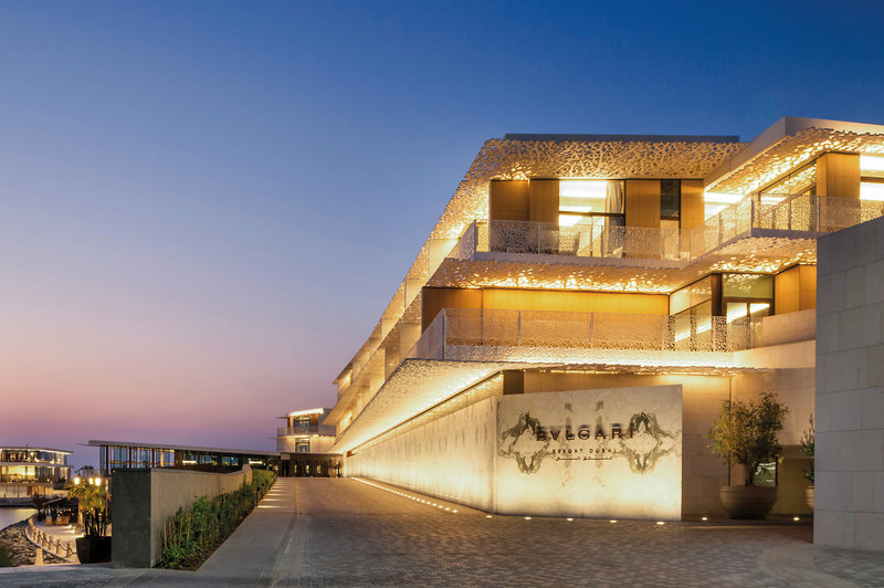Hotel: Luxusný rezort je piatym objektom skupiny Bulgari Hotels and Resorts na celom svete. Hotelový komplex navrhla talianska architektonická kancelária Antonio Citterio Patricia Viel and Partners. Rezort sa nachádza na umelom ostrove Jumeirah Bay Island, ktorý bol vytvorený v tvare morského koníka. Z ulice Jumeirah Beach Road sa hostia dostanú na ostrov cez 300 metrov dlhý most. Samotný rezort Bulgari je oázou zasadenou do sviežej záhrady s veľkými palmami a farebnými kvetmi. Rovnako ako u ostatných hotelov v skupine Bulgari je prevládajúcim materiálom sklo. Dekorácie na fasáde hlavných budov pripomínajú biele koraly – skutočný ostrovný raj uprostred megamesta Dubaj. Okrem hotela sa v komplexe nachádza aj súkromný prístav a súkromný jachtársky klub. Detský klub, fitness centrum, butik Bulgari. Letisko Dubaj je vzdialené približne 20 km.