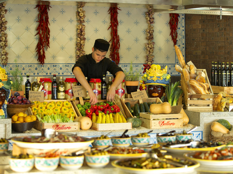 - Hauptrestaurant „Ballaro“: Küche: chinesisch, international, indisch, italienisch, mediterran, regional, Grillgerichte, Diätküche, Kindermenü, saisonale Gerichte, vegetarische Gerichte, Buffet, à la carte, Menüwahl, gesetztes Menü, Showcooking, klimatisierbar, mit Terrasse, Raucherbereich, angemessene Kleidung erwünscht