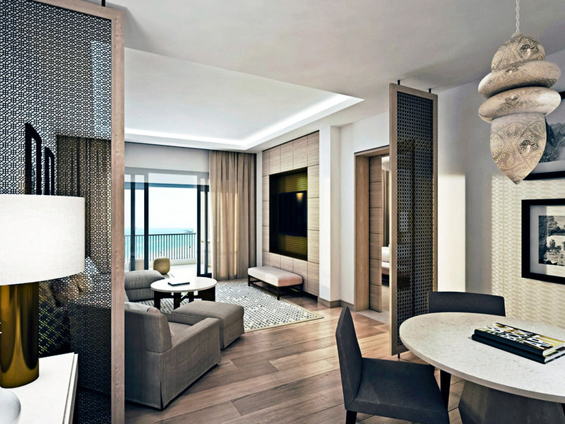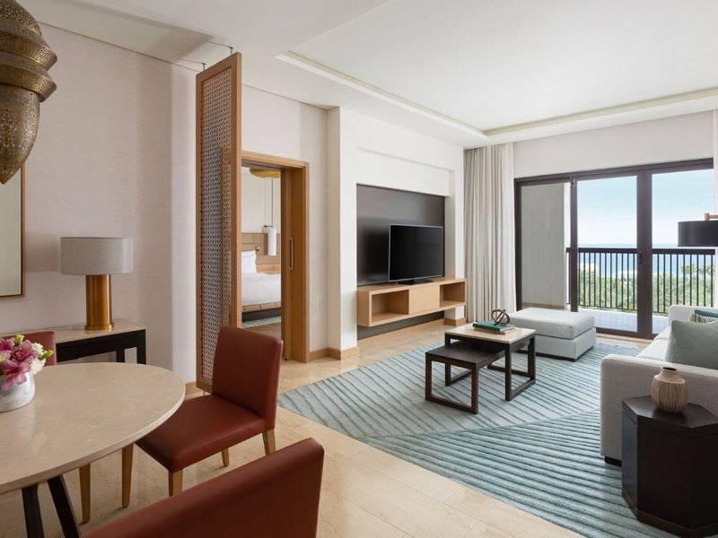 - Resort Suite (SUX1), Doppelzimmer, Nichtraucherzimmer, im Hauptgebäude, Meerblick, Gartenblick, ca. 90 m², Gesamtanzahl der Räume in diesem Zimmertyp: 2, Aufteilung wie folgt: Wohnzimmer, 1 Schlafzimmer, 1 King Size Bett, Babybett: ohne Gebühr, Anfrage notwendig, Klimaanlage: ohne Gebühr, individuell regelbar, Heizung: individuell regelbar, Fußboden: Laminat, Teppichboden, Safe: ohne Gebühr, Sofa, Schreibtisch, Bügeleisen, Bügelbrett, Nespressomaschine, Kaffee-/Teezubereiter, Wasserkocher, Esstisch, Minibar: gegen Gebühr, Barzahlung, Softdrinks: gegen Gebühr, Barzahlung, Wasser: ohne Gebühr, alkoholische Getränke: gegen Gebühr, Barzahlung, Snacks: gegen Gebühr, Barzahlung, Minibarauffüllung: täglich, Telefon, Internet: WLAN/WiFi: ohne Gebühr, Breitband-Internet/DSL: ohne Gebühr, Fernseher: Flatscreen, im Wohnbereich, im Schlafzimmer, Roomservice: täglich, gegen Gebühr, Reinigungsservice: täglich, ohne Gebühr, Dusche, Regendusche, Badewanne, WC, Bademantel: ohne Gebühr, Slipper: ohne Gebühr, Föhn, Kosmetikspiegel, Balkon oder Terrasse: mit Sitzgelegenheit