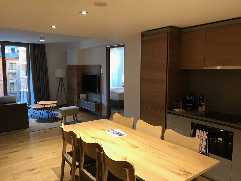 - Residences - 2 Schlafzimmer - Bergblick (APX4), Appartement, Nichtraucherzimmer, im Nebengebäude, Neubau, Bergblick, Innenhofblick, ca. 55 m², Gesamtanzahl der Räume in diesem Zimmertyp: 3, Aufteilung wie folgt: bestehend aus 2 Zimmern, optisch getrennt ohne Tür oder durch Vorhang, Wohnzimmer, 2 Schlafzimmer, 2 King Size Betten (180x200cm), 1 Schlafsofa, Babybett: ohne Gebühr, Anfrage & Reservierung notwendig, Heizung, Fußboden: Parkett, Safe: ohne Gebühr, Sofa, Bügeleisen, Bügelbrett, Kochnische, Kühlschrank, Gas/E-Herd, Mikrowelle, Nespressomaschine, Wasserkocher, Esstisch, Minibar, Telefon, Internet: WLAN/WiFi: ohne Gebühr, Fernseher: Flatscreen, im Wohnbereich, Roomservice: täglich 24 Stunden, Badewanne oder Dusche, WC, Bademantel: ohne Gebühr, Slipper: ohne Gebühr, 2 Bäder, Föhn, Kosmetikspiegel