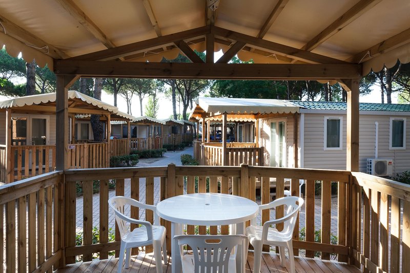 Mobilný dom San Marco [WMS]: Mobilné domy San Marco (WMS, cca 22 m²) až pre 4 osoby majú obývaciu izbu/jedáleň s kuchynkou vrátane riadu, hrncov/panvíc, malého kávovaru (kanvica na espresso 4 šálky) a chladničkou, satelitnou TV, klimatizáciou/kúrením (za poplatok), ako aj 2 spálňami a sprchou/WC. Vonku je látkový altánok, ako aj stôl a stoličky.