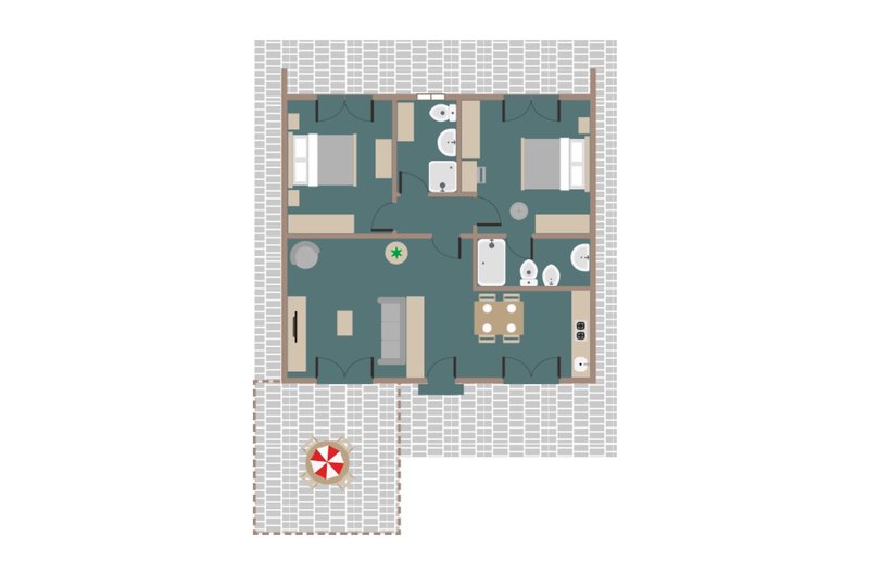 Villa 2 Schlafzimmer [V6]: Die Villen 2 Schlafzimmer (V6, ca. 81 m²) vom Typ "Ca' dei Pini" verfügen bei ansonsten gleicher Ausstattung wie die Appartements 1 Schlafzimmer über ein zweites Badezimmer sowie einen zweiten, separaten Schlafraum mit Doppelbett.