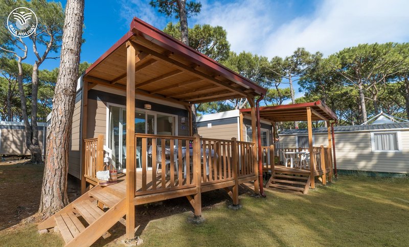 Mobile Home Blu Romantic [WMR]: Die Mobile Homes Blu Romantic (WMR, ca. 24 m²) für bis zu 6 Personen (4 Erwachsene + 2 Kinder) verfügen bei gleicher Ausstattung wie die WMC über ein zusätzliches Stockbett, ein Schlafsofa sowie einen Holz- oder Stoffpavillon im Außenbereich.