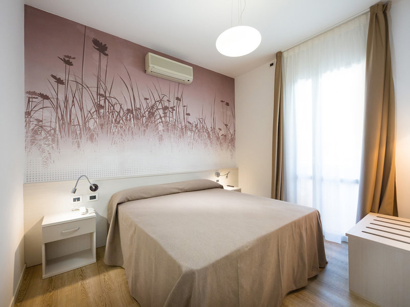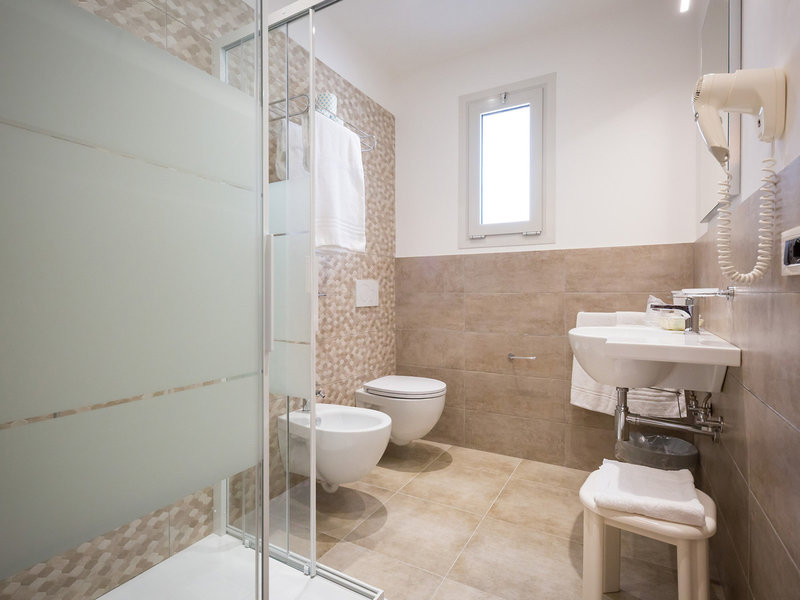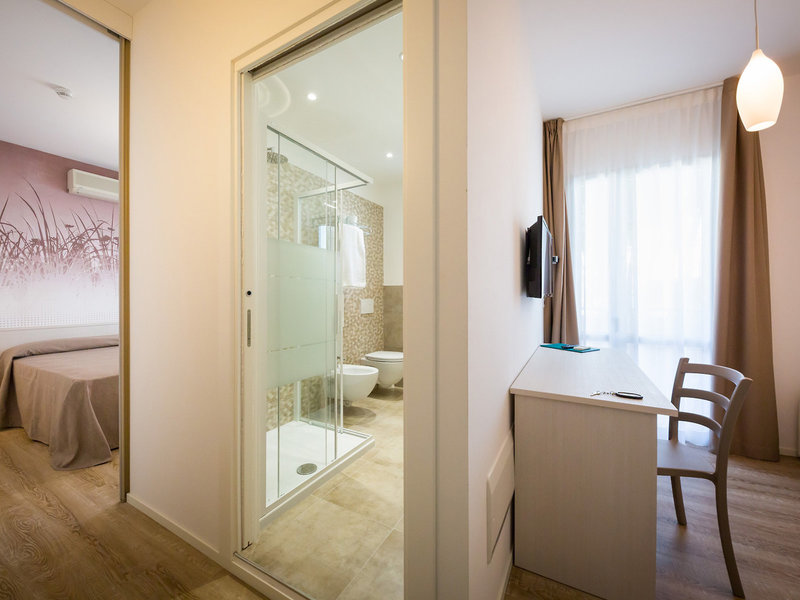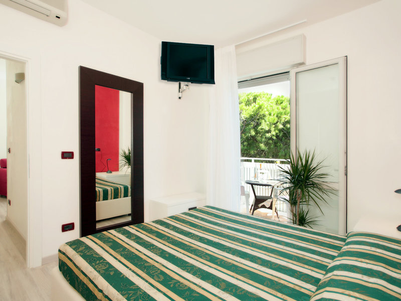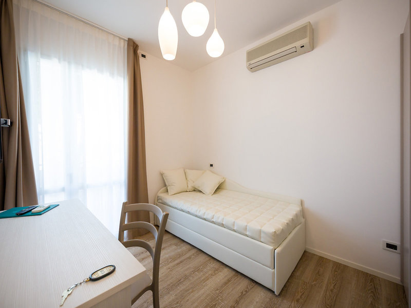 - Singola (EZX1), Jednolôžková izba, v hlavnej budove, orientovaná na východ, čiastočný výhľad na more, cca 10 m², celkový počet izieb tohto typu: 1, 1 manželská posteľ, klimatizácia: individuálne nastaviteľná, centrálne ovládaná, parketová podlaha, trezor: zadarmo, písací stôl, minibar: zadarmo, telefón, internet: Wi-Fi: zadarmo, televízor: v spálni, nemecké kanály, satelitná TV, denné upratovanie, sprcha, WC, fén, balkón: s posedením