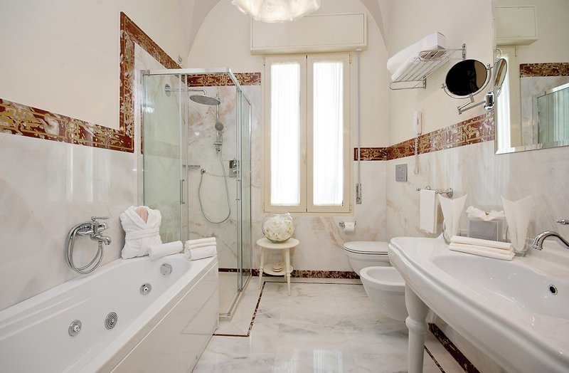 Mit üppiger aber stilvolle Eleganz mit Andeutungen an den Liberty-Stil verdient dieses erste und einzige 5-Sterne-Haus in Cesenatico zu Recht seinen Zusatz "Grand Hotel". In spiegelndem Carrara-Marmor und unter Kronleuchtern fühlt man sich sofort fürstlich aufgenommen. Der große gepflegte Garten mit blühenden Beeten und schattiger Pergola grenzt unmittelbar an den Strand.